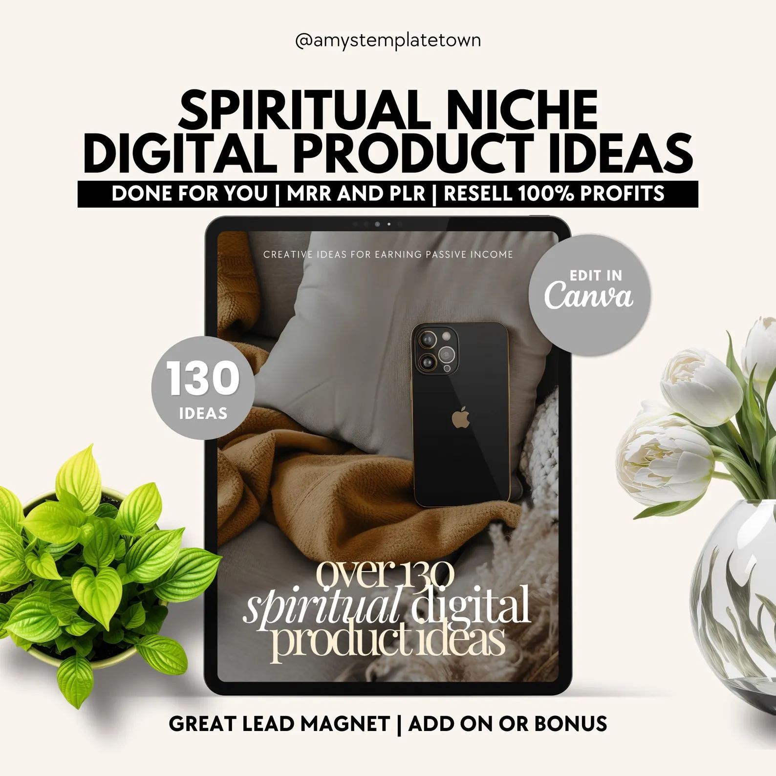130 Spiritual Niche Digital Product Ideas eBook | Editable Canva Template with MRR & PLR Resell Rights
